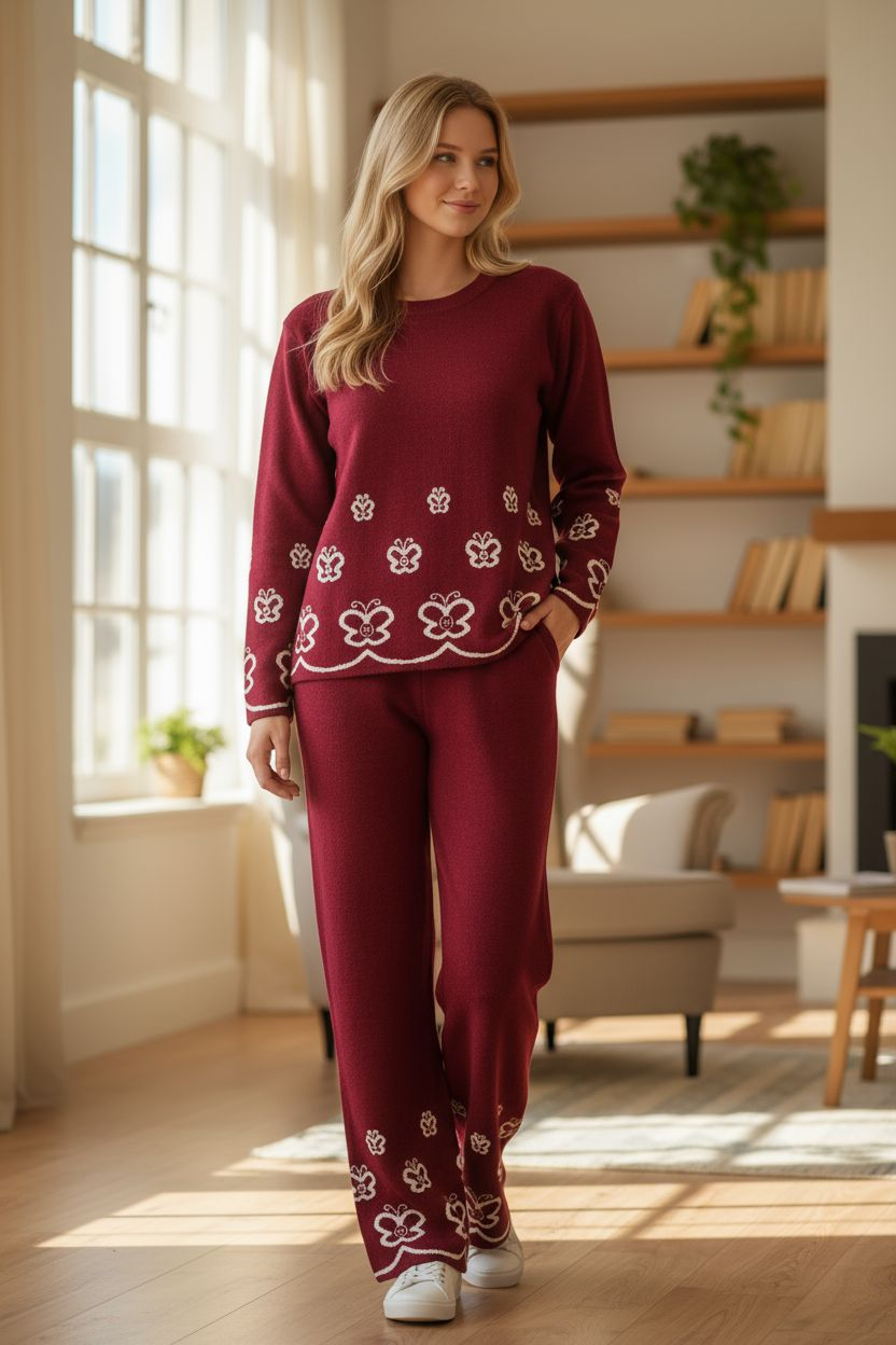 Winter Cozy Loungewear with Floral Detailing | Maroon Knitted Co-Ord SetWinter Cozy Loungewear with Floral Detailing | Maroon Knitted Co-Ord SetWinter Cozy Loungewear with Floral Detailing | Maroon Knitted Co-Ord Set