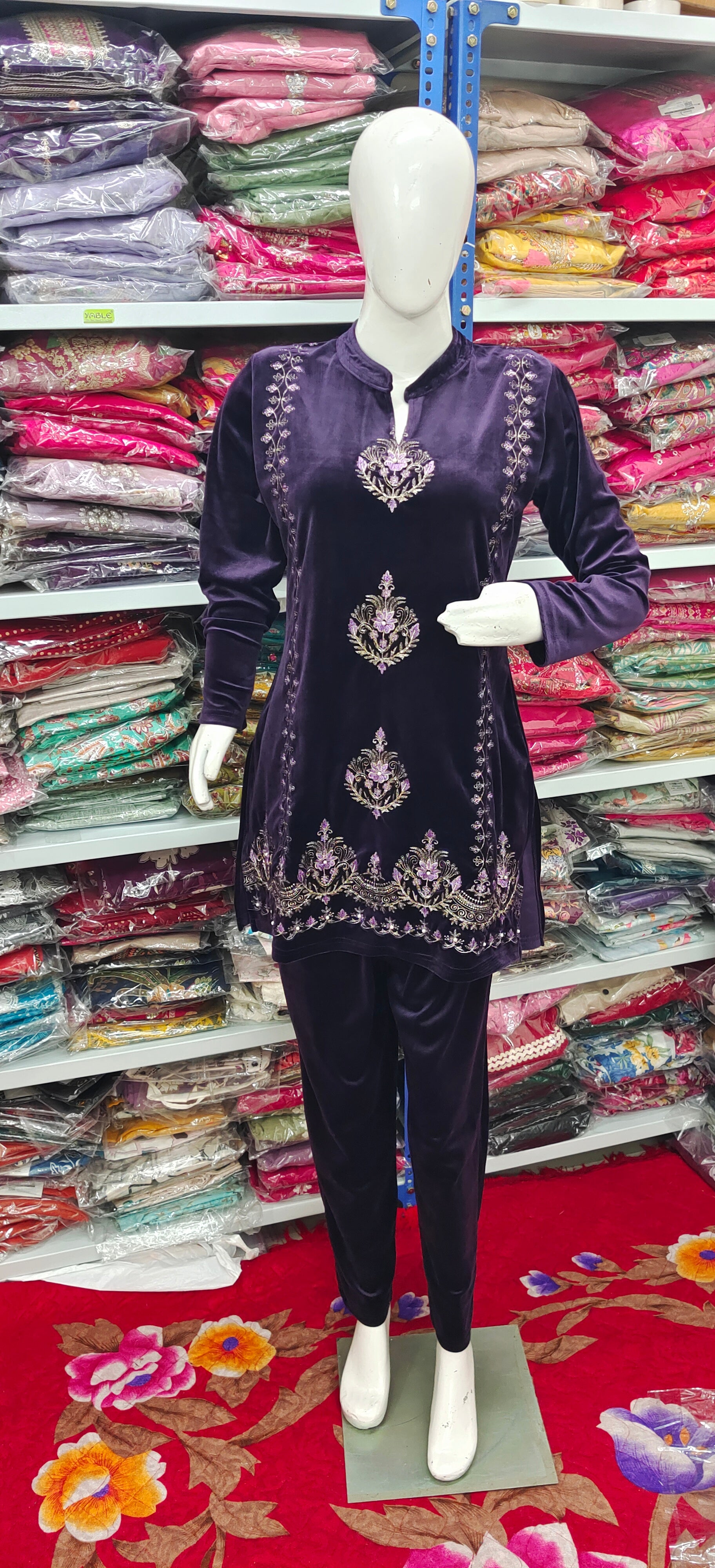 The kurta features intricate golden & lavender thread embroidery on the neckline, front panel, and hem, giving it a regal and sophisticated look. Paired with matching velvet bottoms, this set delivers comfort and grace in equal measure.