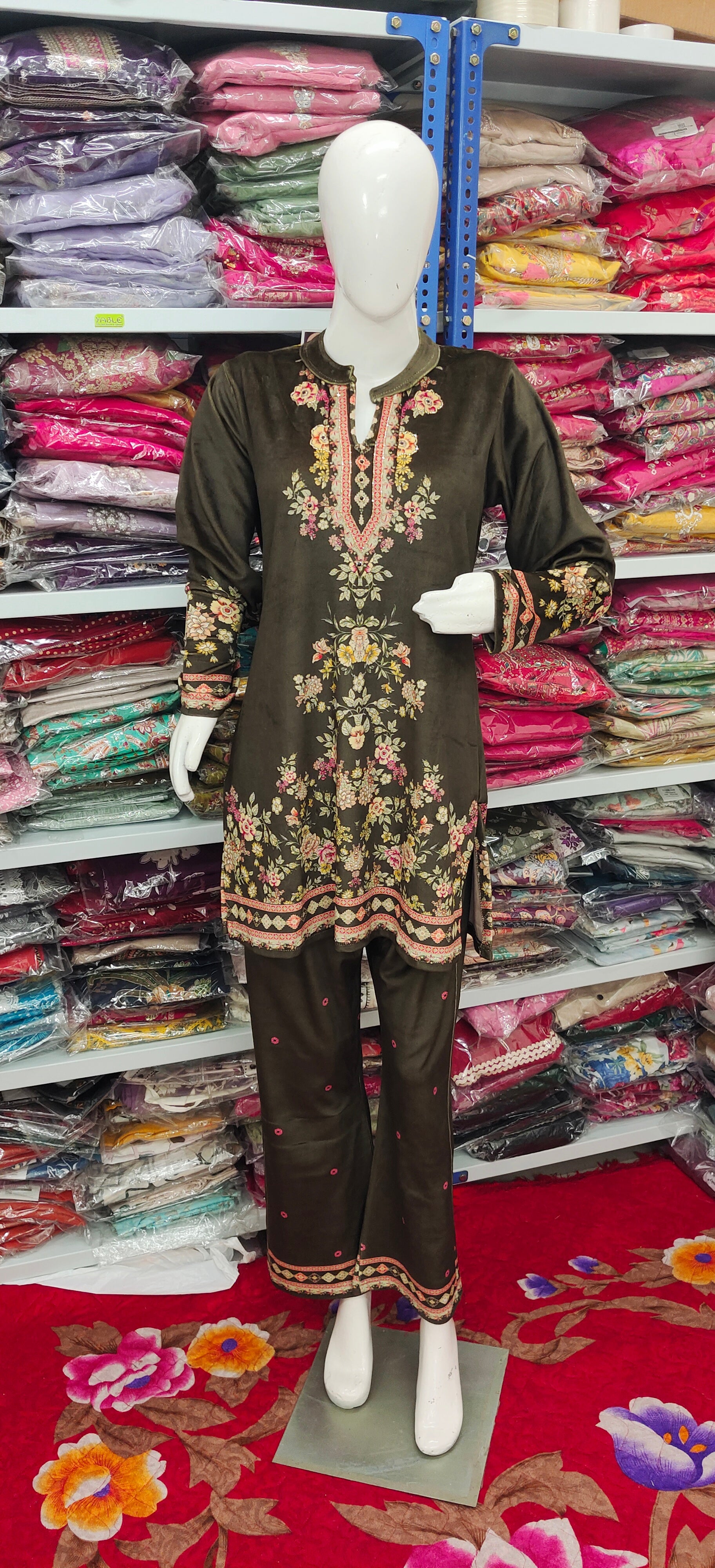 Made from plush winter cord fabric, this set blends comfort and elegance effortlessly. The beautifully detailed kurta with floral embroidery on neckline, sleeves, and hemline pairs gracefully with matching embroidered bottoms — giving you that perfect cozy-luxury look for winter days and festive evenings.